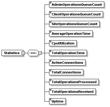 | source | <xs:element name="Statistics"> <xs:complexType> <xs:sequence> <xs:element name="AdminOperationsQueueCount" type="xs:integer"/> <xs:element name="ClientOperationsQueueCount" type="xs:integer"/> <xs:element name="SiteOperationsQueueCount" type="xs:integer"/> <xs:element name="AverageOperationTime" type="xs:integer"/> <xs:element name="CpuUtilization" type="xs:integer"/> <xs:element name="TotalOperationTime" type="xs:integer"/> <xs:element name="ActiveConnections" type="xs:integer"/> <xs:element name="TotalConnections" type="xs:integer"/> <xs:element name="TotalOperationsProcessed" type="xs:integer"/> <xs:element name="TotalOperationsReceived" type="xs:integer"/> <xs:element name="Uptime" type="xs:integer"/> </xs:sequence> </xs:complexType> </xs:element> |